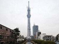La torre, situada en el este de Tokio, cuenta con dos observatorios, uno a 350 metros de altura y otro a 450, y tiene además una pasarela esférica con un cristal panorámico.